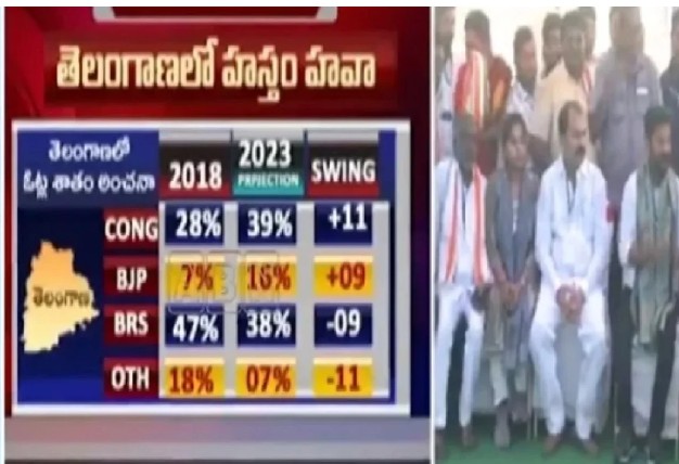 తెలంగాణ అసెంబ్లీ ఎన్నికల్లో కాంగ్రెస్ పార్టీకి 54 సీట్లు, బీఆర్ఎస్కు 49 సీట్లు రావొచ్చని ఇండియా టు డే సర్వే తెలిపింది. బీజేపీకి ఎనిమిది, ఇతరులు ఎనిమిది చొప్పున సీట్లు గెలుచుకుంటారని తెలిపింది. అయితే, కాంగ్రెస్ పార్టీకి గతంలో కంటే 11 శాతం ఓటు బ్యాంకు పెరిగి 39 శాతానికి చేరుకుందని, అధికార భారత రాష్ట్ర సమితికి 9 శాతం ఓటు బ్యాంకు తగ్గి 38 శాతానికి చేరుకుందని, బీజేపీకి 7 శాతం నుంచి 9 శాతం ఓటు పెరిగి 16 శాతానికి చేరుకుందని సర్వే వెల్లడించింది.