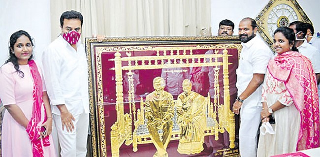తెలంగాణ ముఖ్యమంత్రి కేసీఆర్ - శోభ దంపతుల పంచలోహ చిత్రాలతో ఓ చిత్రపటాన్ని ప్రత్యేకంగా రూపొందించారు. దీన్ని రాష్ట్ర మంత్రి శ్రీనివాస్ గౌడ్ తయారు చేయించారు. ఈ పంచలోహ చిత్రపటాన్ని తెరాస వర్కింగ్ ప్రెసిడెంట్, రాష్ట్ర మంత్రి కేటీఆర్కు అందేశారు. ఇటీవల కేటీఆర్ పుట్టిన రోజు వేడుక జరిగింది. ఆ రోజన ఈ పటాన్ని అందజేశారు.