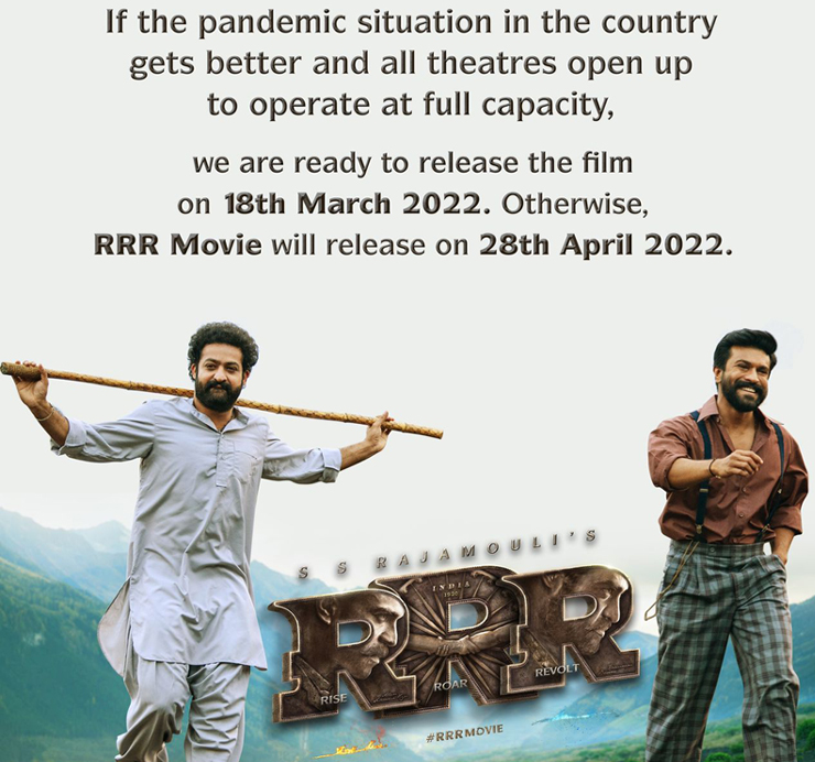 దేశంలో మహమ్మారి పరిస్థితి మెరుగుపడి, అన్ని థియేటర్లు పూర్తి సామర్థ్యంతో పనిచేయడానికి తెరిస్తే, ఆఱ్.ఆర్.ఆర్. చిత్రాన్ని 18 మార్చి 2022న విడుదల కానుంది.