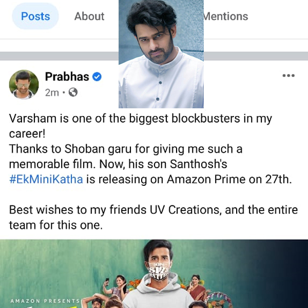 అమెజాన్ ప్రైమ్ వీడియో సమర్పణలో యూవీ కాన్సెప్ట్స్, మ్యాంగ్ మాస్ మీడియా సంయుక్తంగా నిర్మిస్తున్న చిత్రం ఏక్ మినీ కథ. ప్రస్తుత పరిస్థితుల రీత్య, ఈ సినిమాను డైరెక్ట్ ఓటిటి పద్ధతిలో మే27న అమెజాన్ ప్రైమ్ వీడియోలో డైరెక్ట్ ఓటిటి పద్ధతిలో విడుదల చేస్తున్నారు. ఇప్పటికే విడుదలైన ఏక్ మినీ కథ ప్రమోషన్ కంటెంట్ కి అన్ని వర్గాల ప్రేక్షకుల్లో ఆదరణ లభిస్తోంది. తాజాగా విడుదలైన ట్రైలర్ కూడా సోషల్ మీడియాలో ట్రెండ్ అవుతుంది. ఈ నేపథ్యంలో రెబల్ స్టార్ ప్రభాస్ ఏక్ మినీ కథ ట్రైలర్ ని తన సోషల్ మీడియా హ్యాండిల్స్ ద్వారా షేర్ చేసి, ఏక్ మినీ కథ చిత్ర బృందానికి శుభాకాంక్షలు తెలిపారు.
